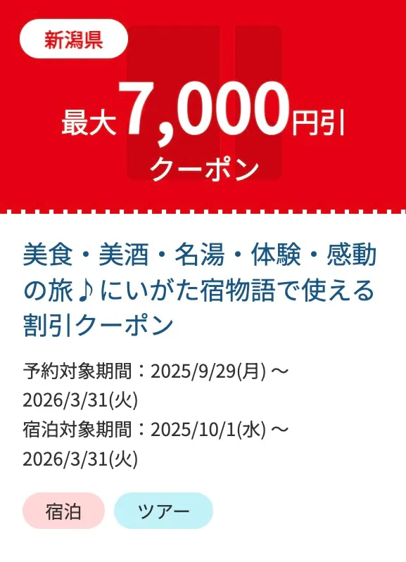 | 美食・美酒・名湯・体験・感動の旅♪にいがた宿物語で使える割引クーポン |