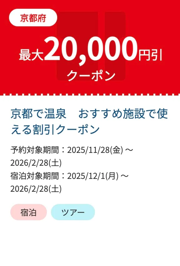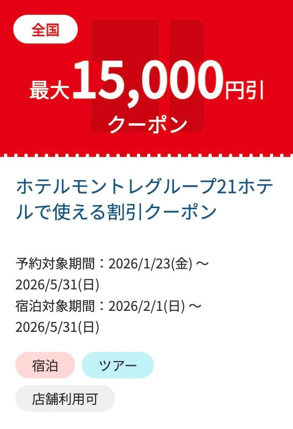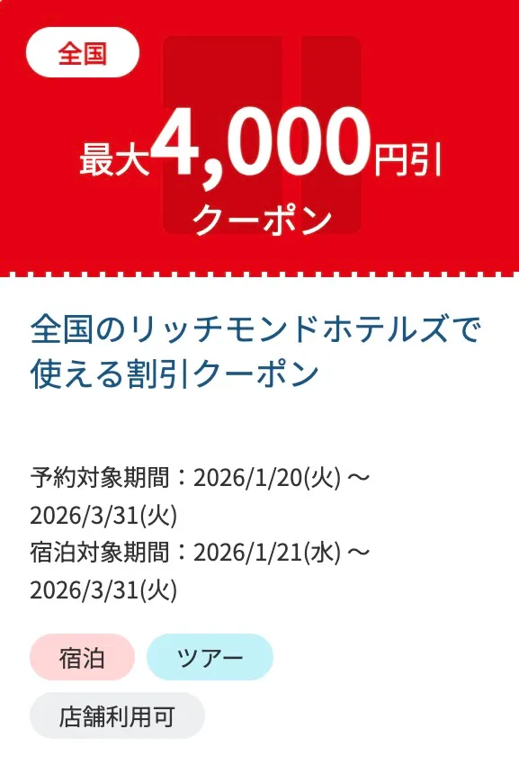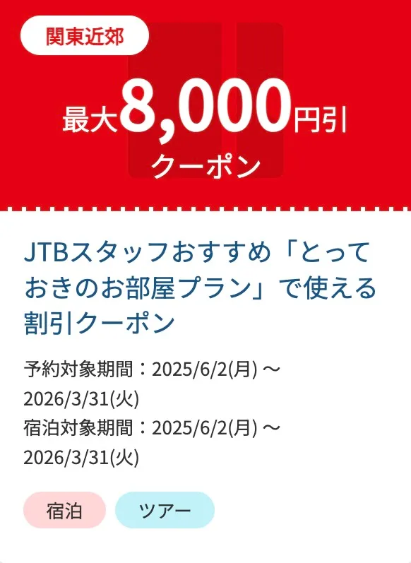 30,000円以上:4,000円引 (適用除外日:土曜日、日曜日、12/27〜1/4/利用者条件:JTBトラベルメンバー会員限定/居住地条件:なし) (利用可能箇所:Web予約・JTB店舗・JTB提携販売店・JTB旅の予約センター・JTBリモートコンシェルジュ・JCBトラベル) |