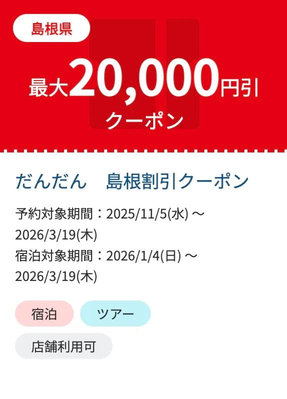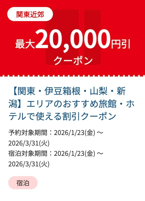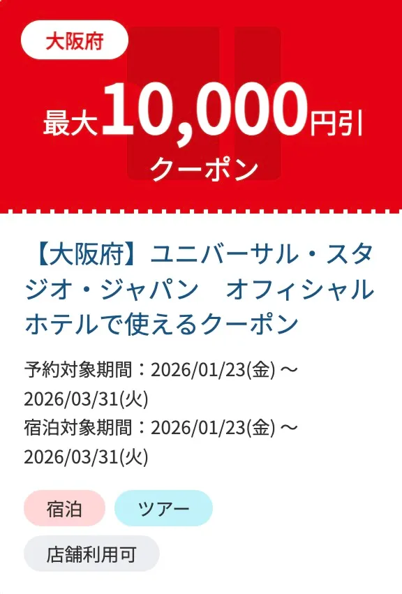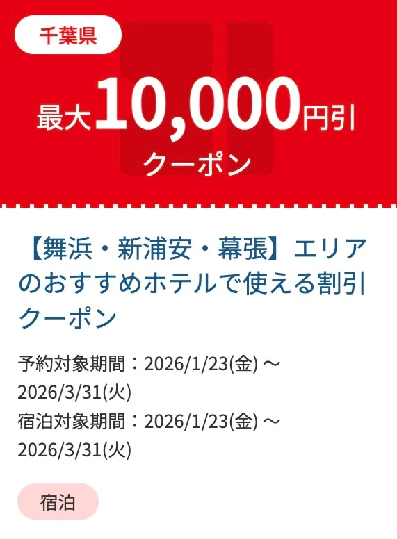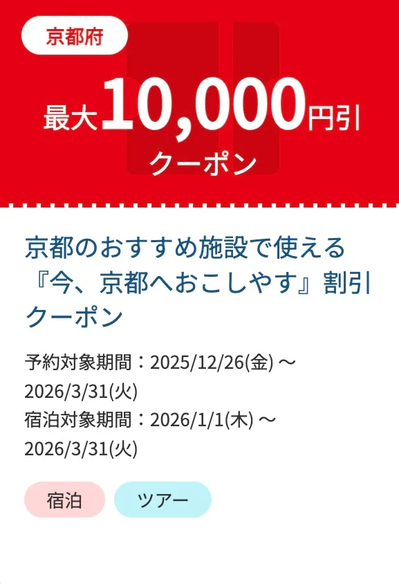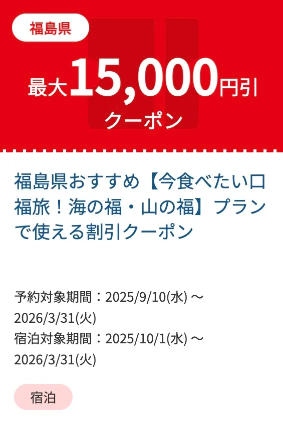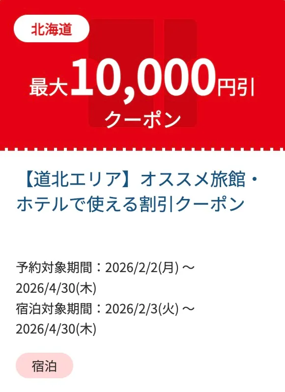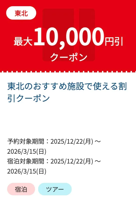 | 「日本の旬 東北」 東北エリアのおすすめ施設で使える割引クーポン | 【宿泊・ツアー】1,000円引(10,000円以上のご利用で) | tohok | g372 | 2026/1/23(金) ~ 2026/7/12(日) | 2026/4/1(水) ~ 2026/7/12(日) |