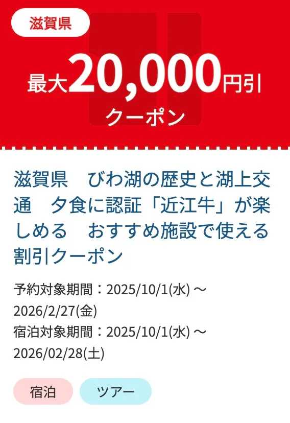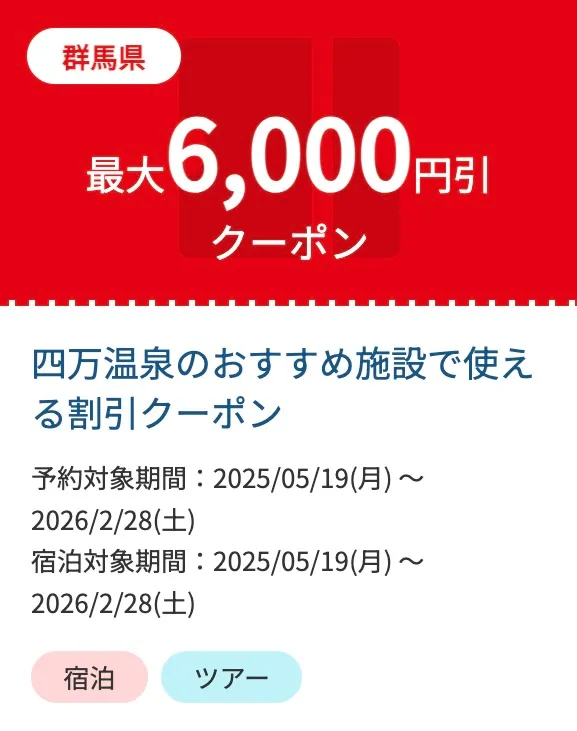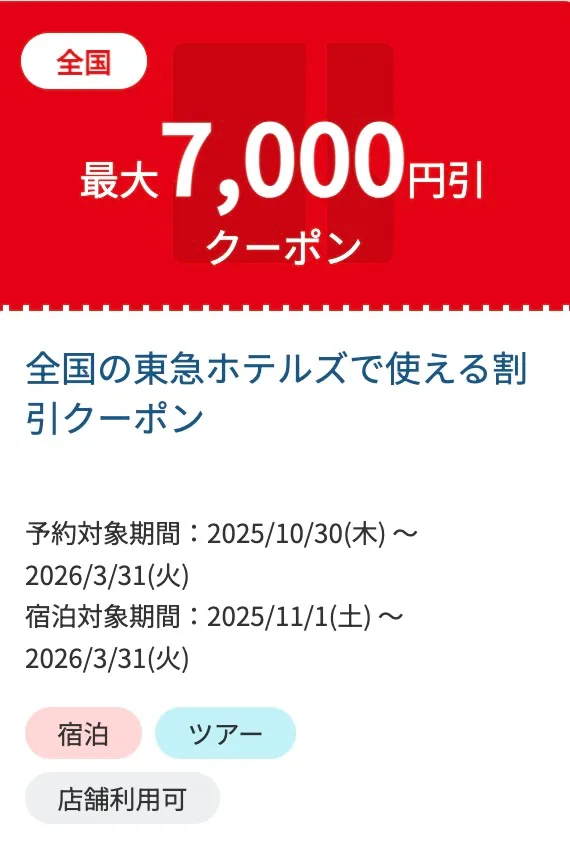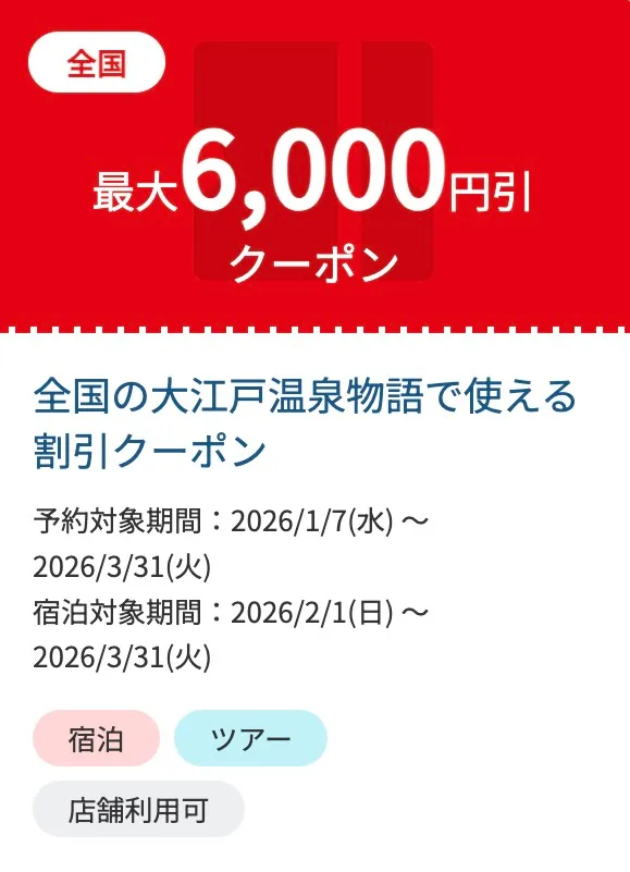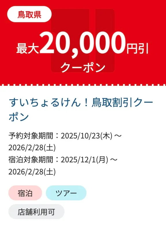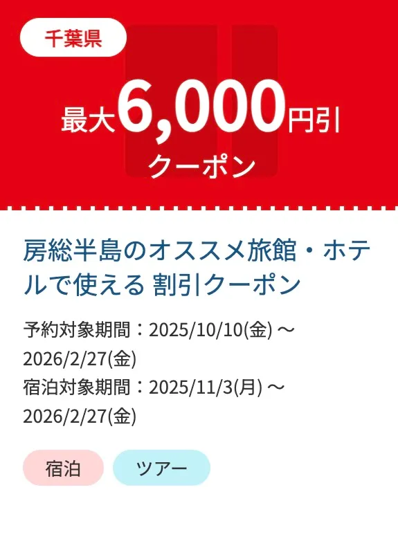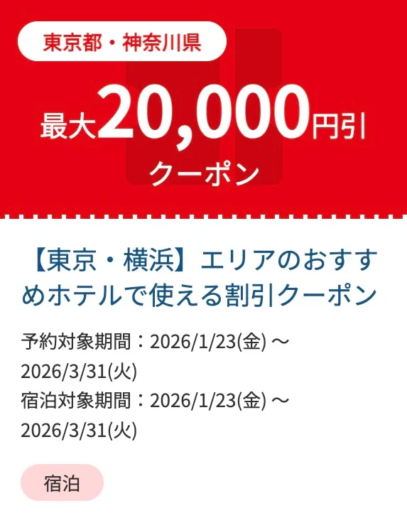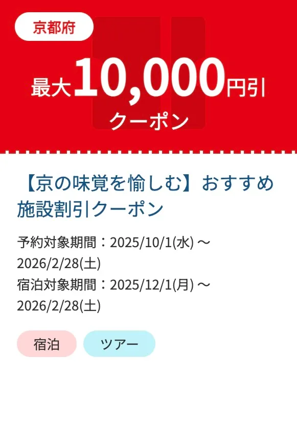 | 「日本の旬 東北」 東北エリアのおすすめ施設で使える割引クーポン | 【宿泊・ツアー】1,000円引(10,000円以上のご利用で) | tohok | g372 | 2026/1/23(金) ~ 2026/7/12(日) | 2026/4/1(水) ~ 2026/7/12(日) |