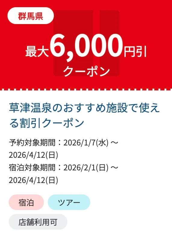 | 草津温泉のおすすめ施設で使える割引クーポン |