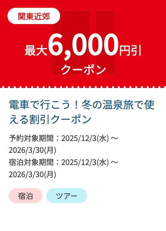| 電車で行こう!冬の温泉旅で使える割引クーポン |