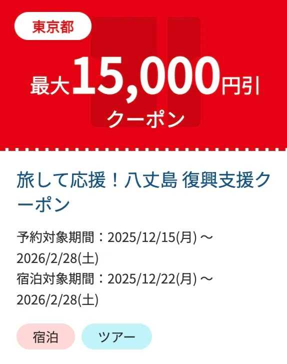 | 羽田から約55分!東京のリゾートアイランド八丈島へ行こう!割引クーポン | 【ツアー(飛行機利用)】30%引(下限金額なし/最大15,000円引/1名以上/泊数指定なし) | hachi | g165 | 2025/8/18(月) ~ 2025/9/30(火) 2025/10/1(水) ~ 2025/11/30(日) 2025/12/1(月) ~ 2026/2/28(土) |