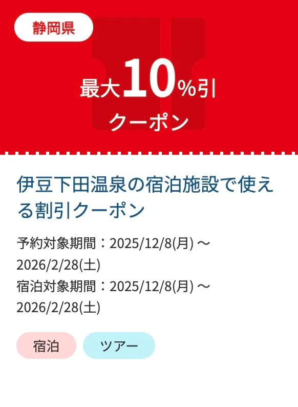 | 伊豆下田温泉の宿泊施設 | 10%引(上限5,000円)/下限金額なし | shimo | g352 | 宿泊/ツアー | 2025/12/8〜2026/2/28 | 2025/12/8〜2026/2/28 |