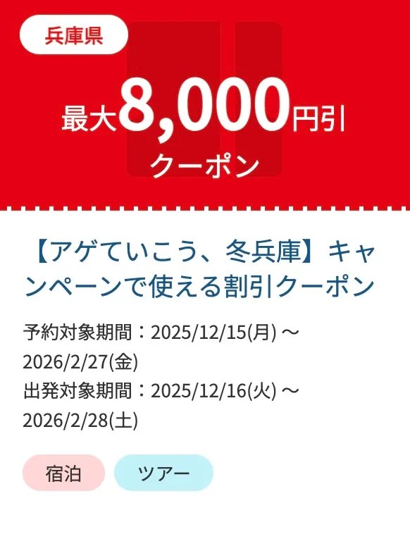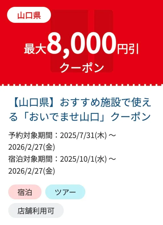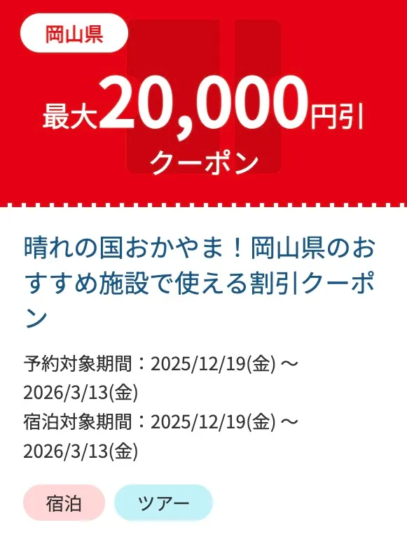 | 【山陽発限定】JR西日本利用のツアーで使えるクーポン(5,000円引) | 80,000円以上のご利用で 5,000円引 | jrfsc | g399 | 2026/1/21(水)〜2026/3/20(金) | 2026/1/22(木)〜2026/3/30(月) |