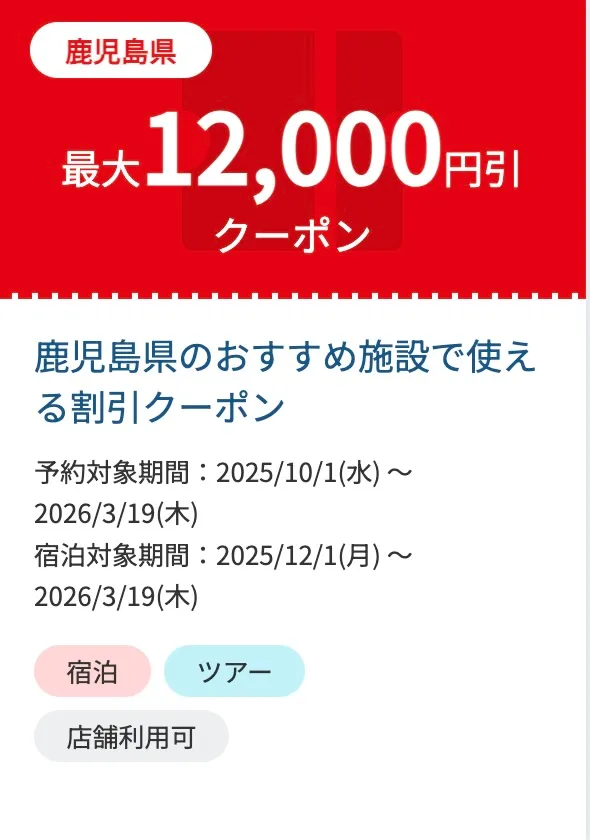 | 鹿児島県内のおすすめ施設で利用可能な割引クーポン(12月〜3月宿泊/1名以上) | 8,000円以上のご利用で 10%引(割引上限2,500円) | kagoc | g367 | 2025/12/17(水)〜2026/3/28(土) | 2025/12/18(木)〜2026/3/29(日) |