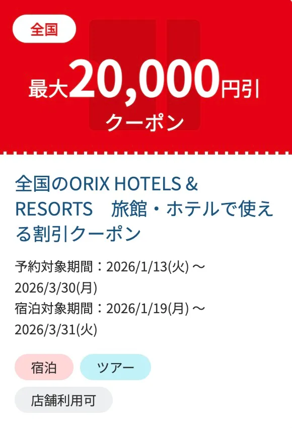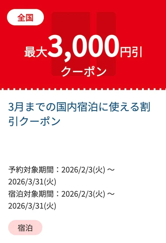宿泊/ツアー | 2026/1/20〜2026/3/31 | 2026/1/21〜2026/3/31 |