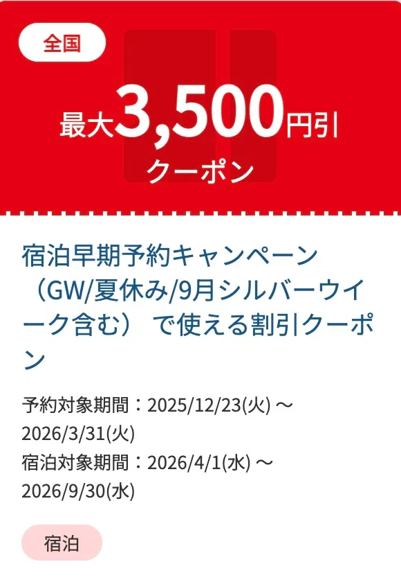 | クーポン名(クリックで詳細へ) | 割引(条件別) | クーポンコード | パス(複数) | 対象プラン | 予約対象期間 | 出発・宿泊対象期間 |