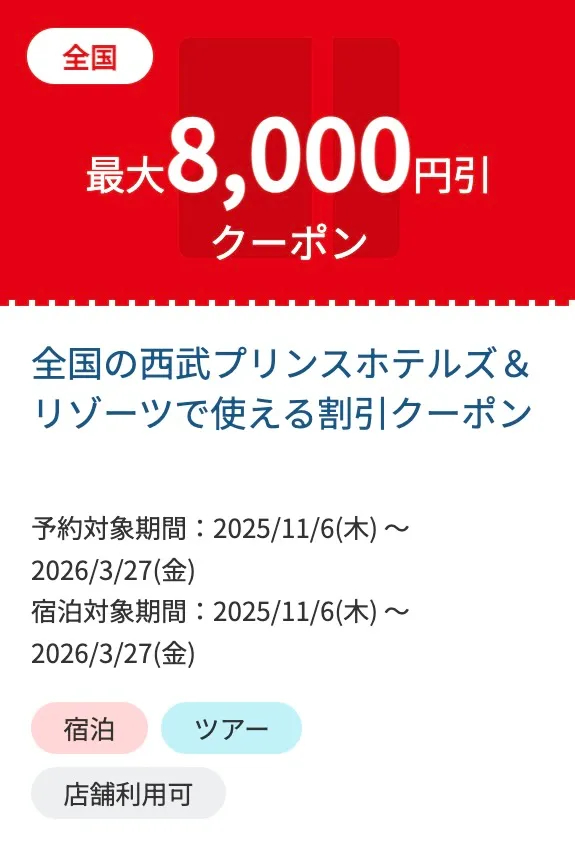 | 全国の西武プリンスホテルズ&リゾーツで使える割引クーポン |