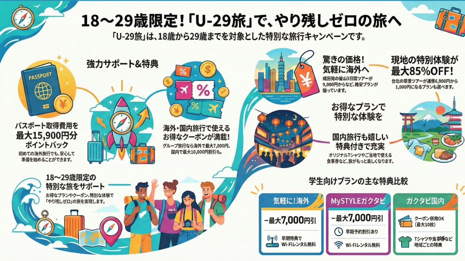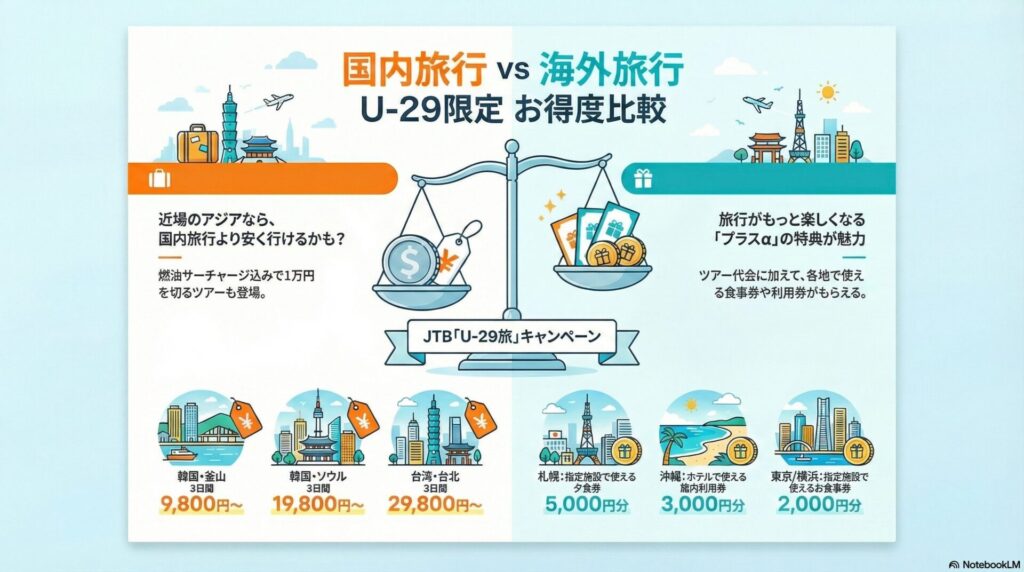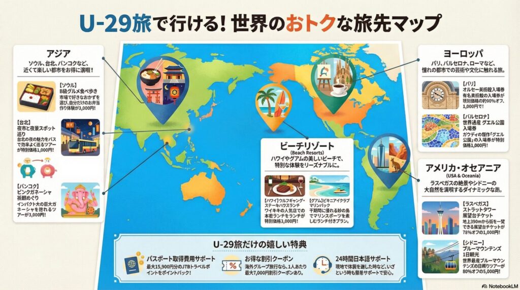 U-29旅は、18歳〜29歳限定でJTBが展開する海外旅行キャンペーン。割引率・サポート体制・行き先の選択肢がとにかく充実しており、海外初心者でも安心して利用できます。