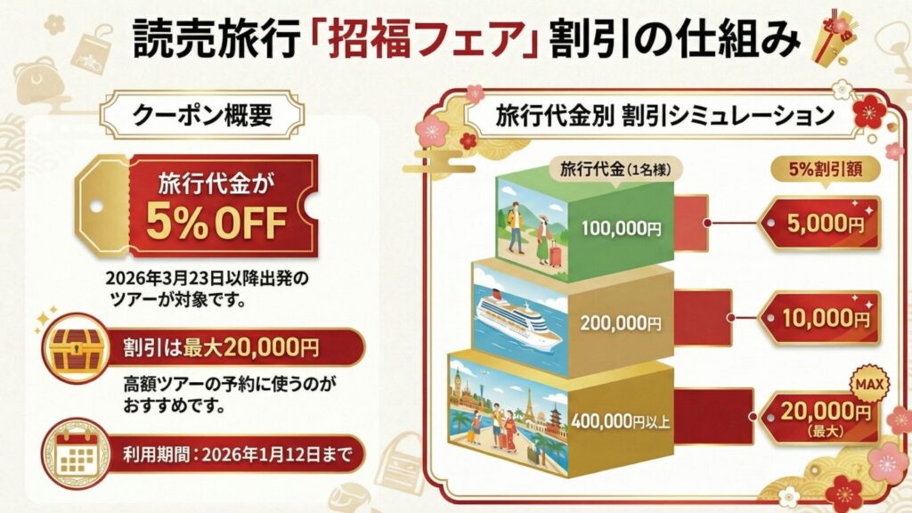 ここからは、招福フェアの仕組みをまず押さえましょう。実はこれを理解しておくと「どの旅行が一番得か?」が一瞬で分かります。