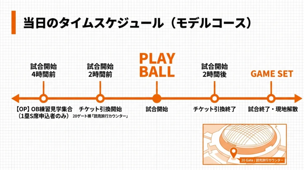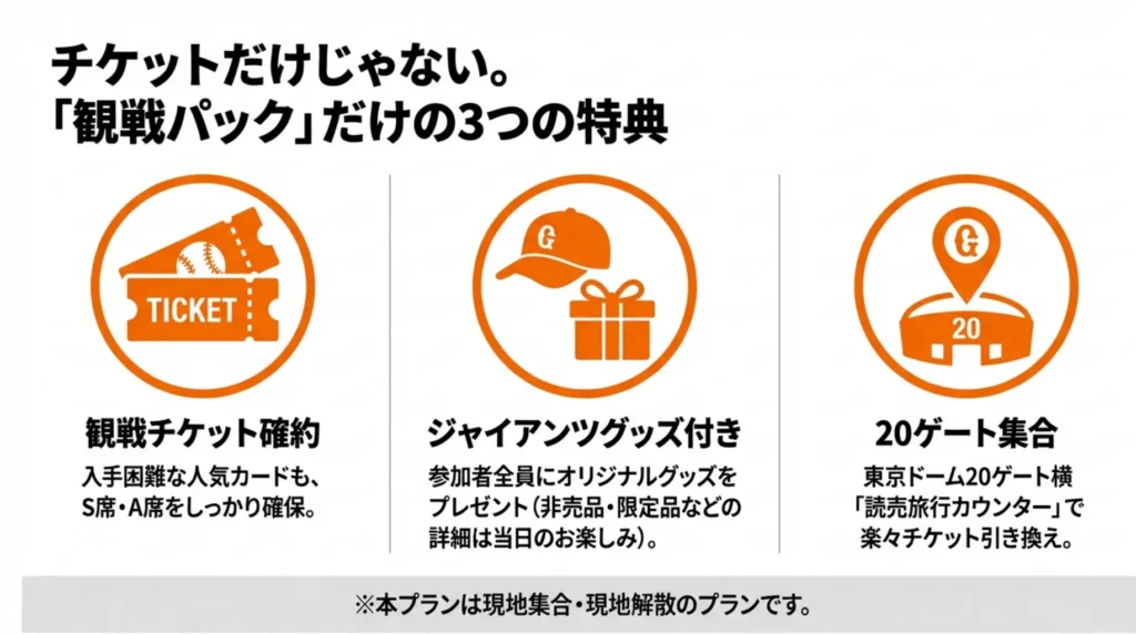 - **20ゲート左手「読売旅行カウンター」**で、チケットとグッズを受け取る