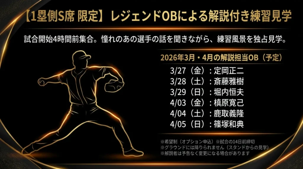 S席の一部プランでは、希望者向けにOBによる解説付き練習見学が案内されています。