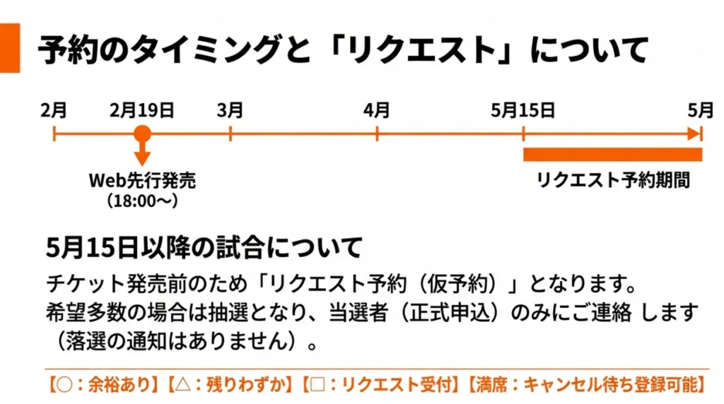 - 5/15以降の試合:**リクエスト予約(抽選)**になる場合がある